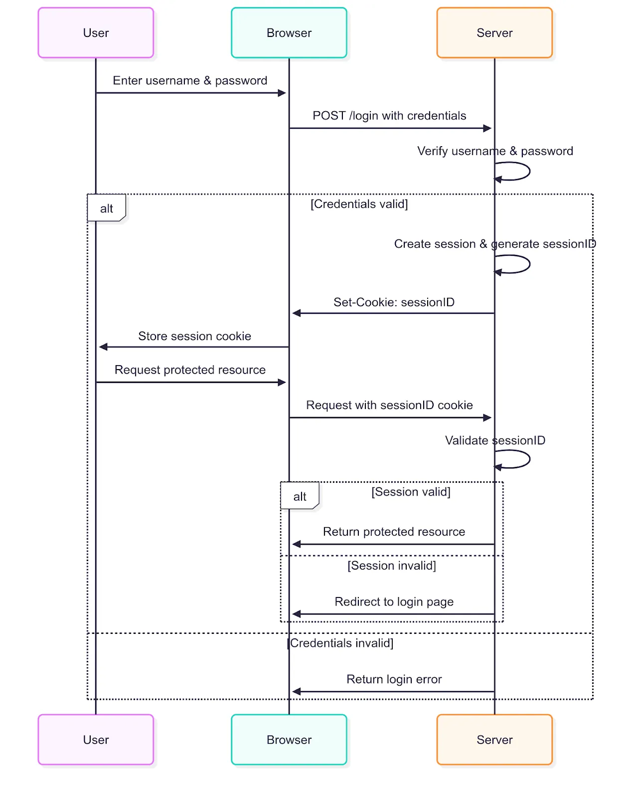 From then on, for every request the user makes (like clicking on a new page), the browser automatically sends this cookie back to the server. The server uses the Session ID from the cookie to look up the user’s session data and confirm they are authenticated.