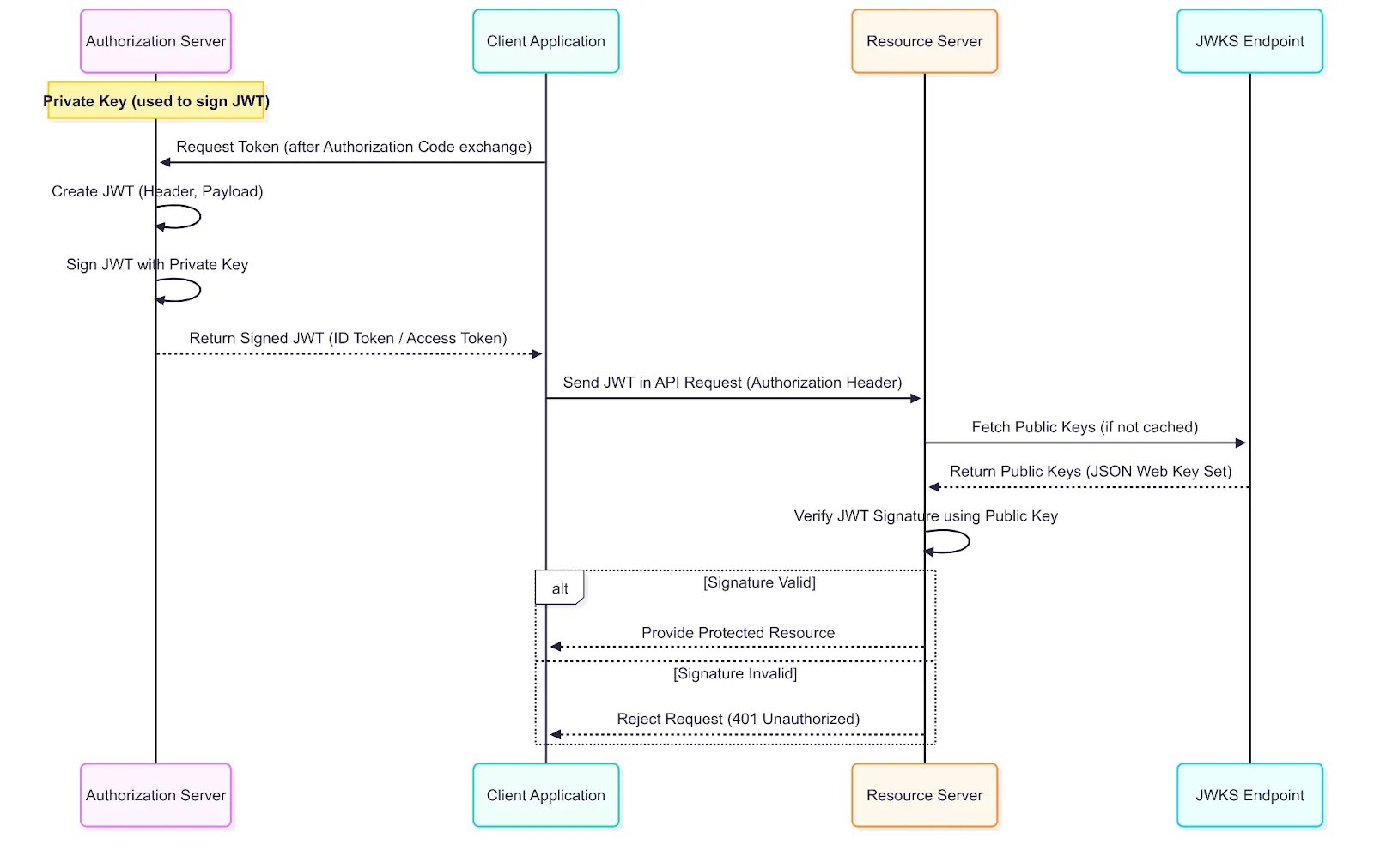 The following sequence diagram shows how JWT enables secure and independent validation at each resource server.