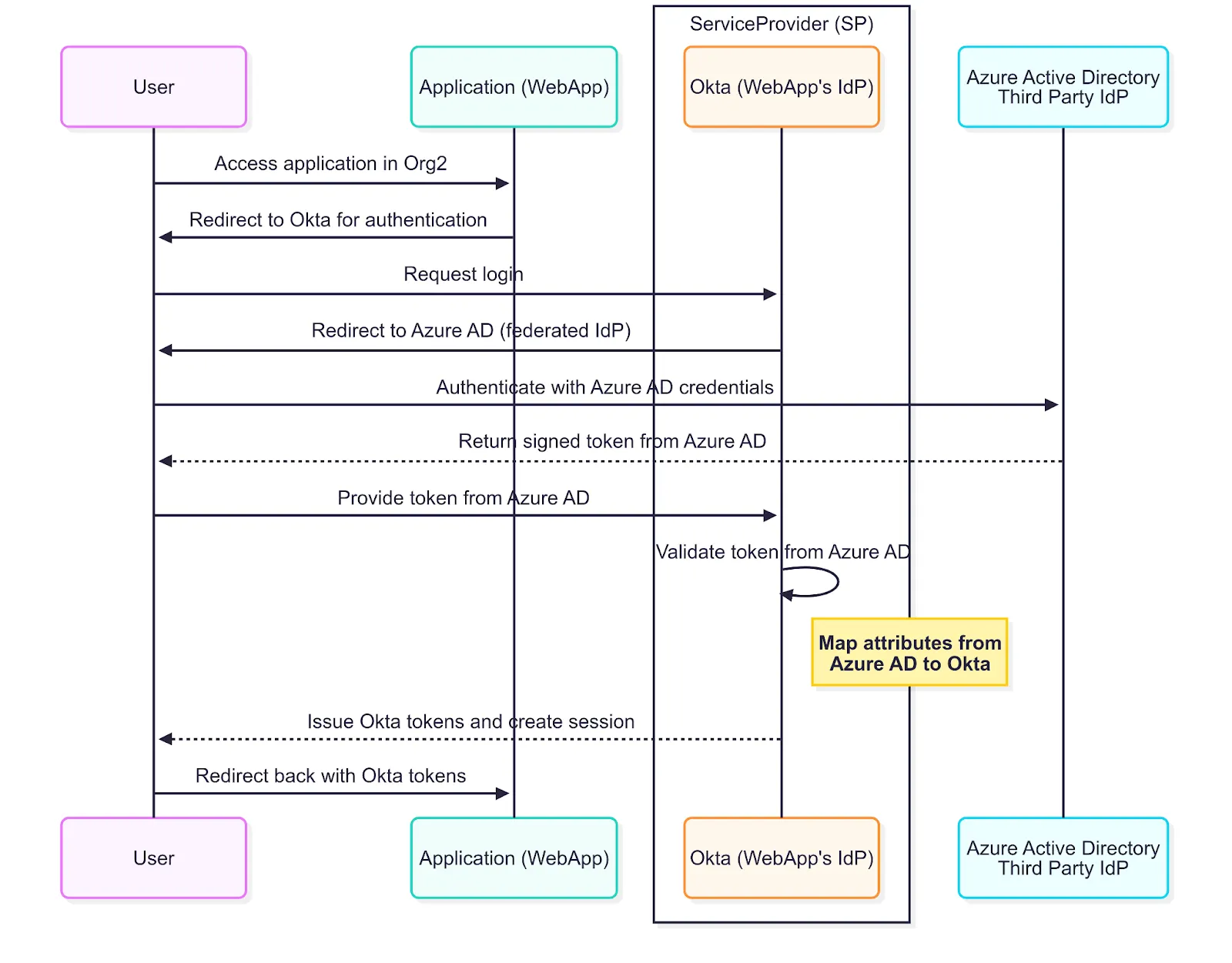 her IdP (think: our office), like Okta, often referred to as a service provider. Instead of managing separate credentials for each system, users rely on their home organization’s credentials, while your application trusts the external IdP’s authentication.